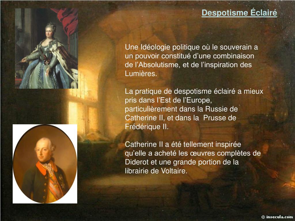 Despotisme Éclairé Une Idéologie politique où le souverain a un pouvoir constitué d’une combinaison de l’Absolutisme, et de l’inspiration des Lumières. La pratique de despotisme éclairé a mieux pris dans l’Est de l’Europe, particulièrement dans la Russie de Catherine II, et dans la Prusse de Frédérique II. Catherine II a été tellement inspirée qu’elle a acheté les œuvres complètes de Diderot et une grande portion de la librairie de Voltaire.