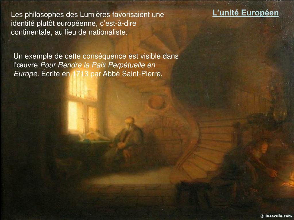 L’unité Européen Les philosophes des Lumières favorisaient une identité plutôt européenne, c’est-à-dire continentale, au lieu de nationaliste. Un exemple de cette conséquence est visible dans l’œuvre Pour Rendre la Paix Perpétuelle en Europe. Écrite en 1713 par Abbé Saint-Pierre.