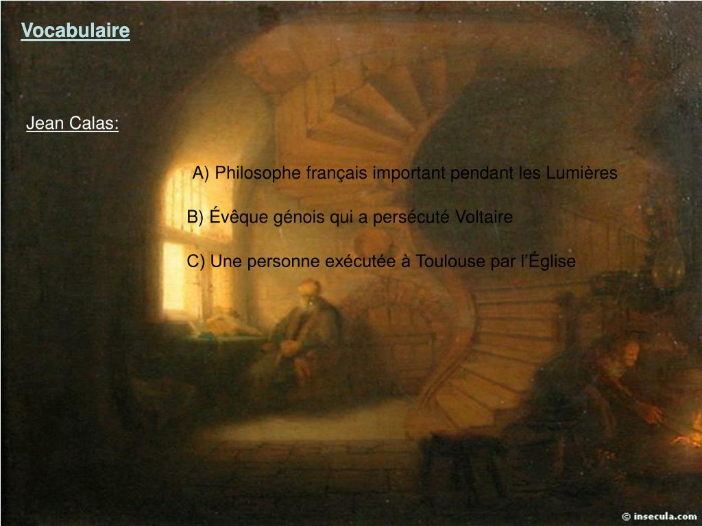 Vocabulaire Vocabulaire Jean Calas: A) Philosophe français important pendant les Lumières B) Évêque génois qui a persécuté Voltaire C) Une personne exécutée à Toulouse par l’Église