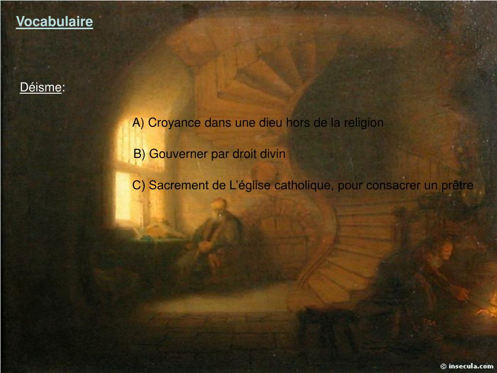 Vocabulaire Déisme: A) Croyance dans une dieu hors de la religion B) Gouverner par droit divin C) Sacrement de L’église catholique, pour consacrer un prêtre