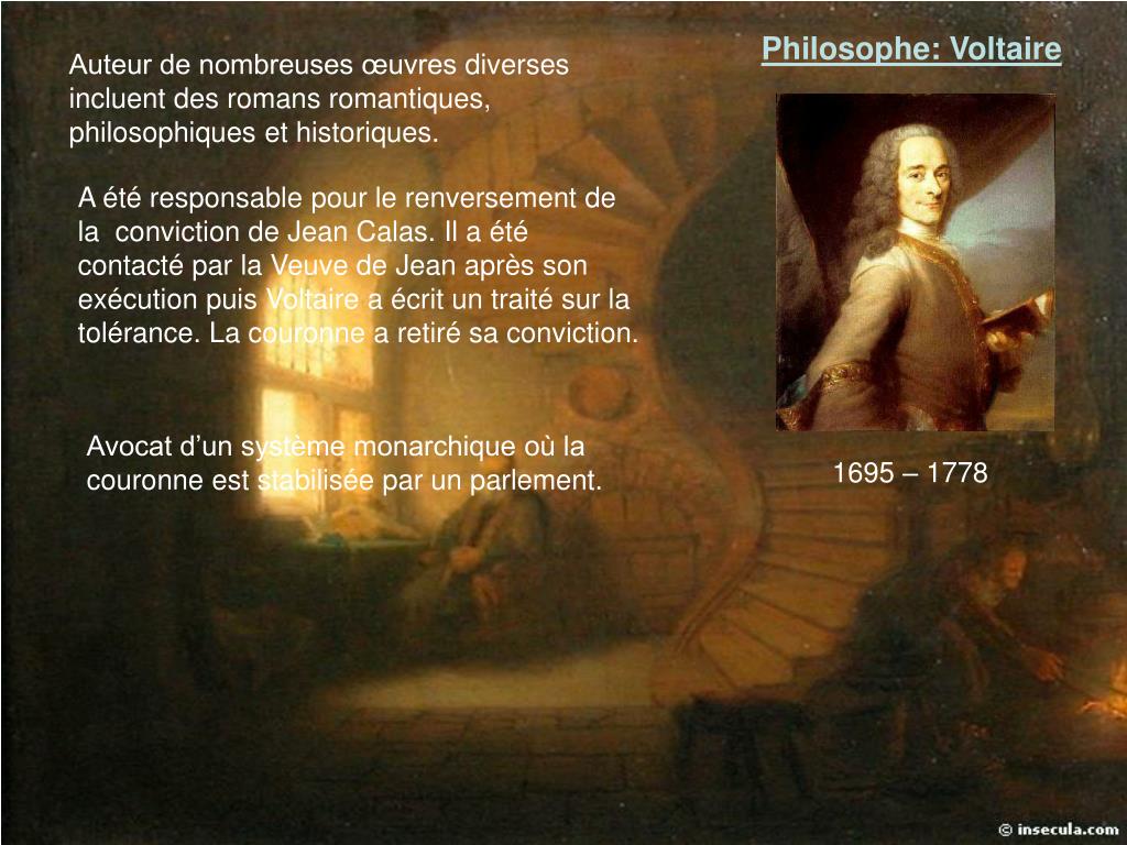 Philosophe: Voltaire Auteur de nombreuses œuvresdiversesincluentdes romans romantiques, philosophiques et historiques. A été responsable pour le renversement de la conviction de Jean Calas. Il a été contacté par la Veuve de Jean après son exécution puis Voltaire a écrit un traité sur la tolérance. La couronne a retiré sa conviction. Avocat d’un système monarchique où la couronne est stabilisée par un parlement. 1695 – 1778