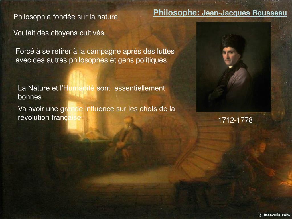 Philosophe: Jean-Jacques Rousseau Philosophie fondée sur la nature Voulait des citoyens cultivés Forcé à se retirer à la campagne après des luttes avec des autres philosophes et gens politiques. La Nature et l’Humanité sont essentiellement bonnes Va avoir une grande influence sur les chefs de la révolution française 1712-1778