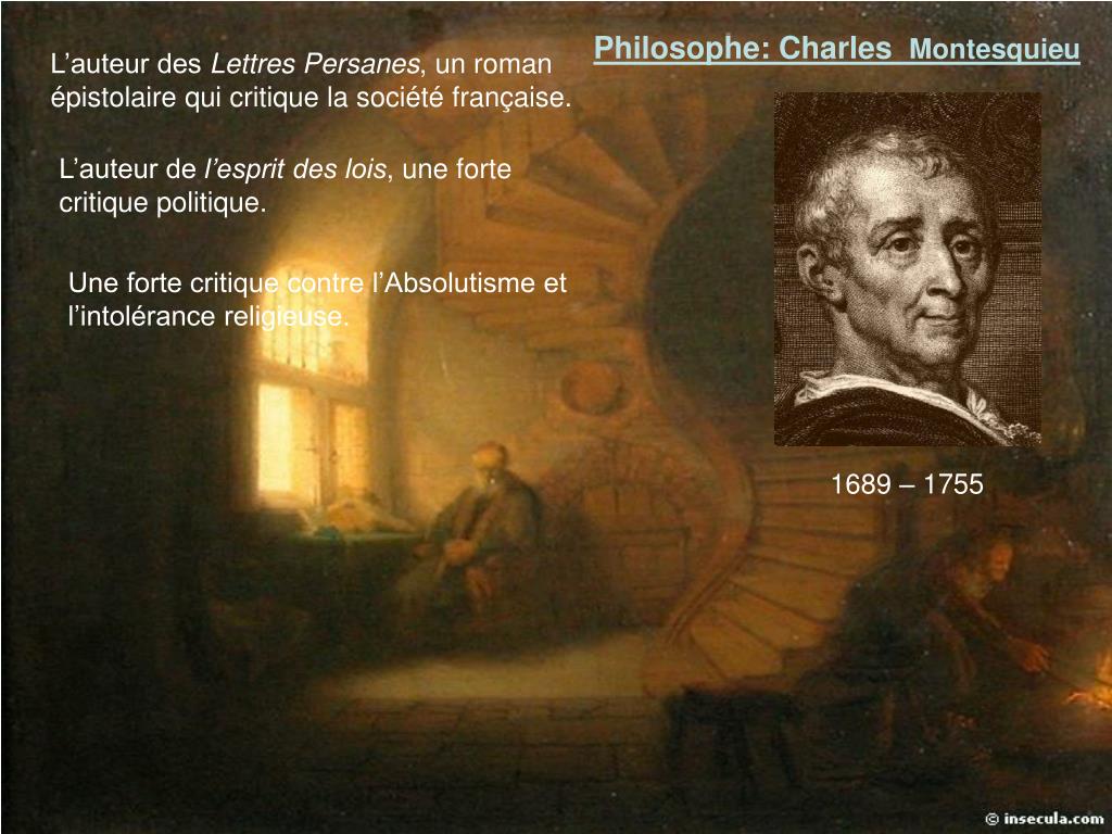 Philosophe: Charles Montesquieu L’auteur des Lettres Persanes, un roman épistolaire qui critique la société française. L’auteur de l’esprit des lois, une forte critique politique. Une forte critique contre l’Absolutisme et l’intolérance religieuse. 1689 – 1755