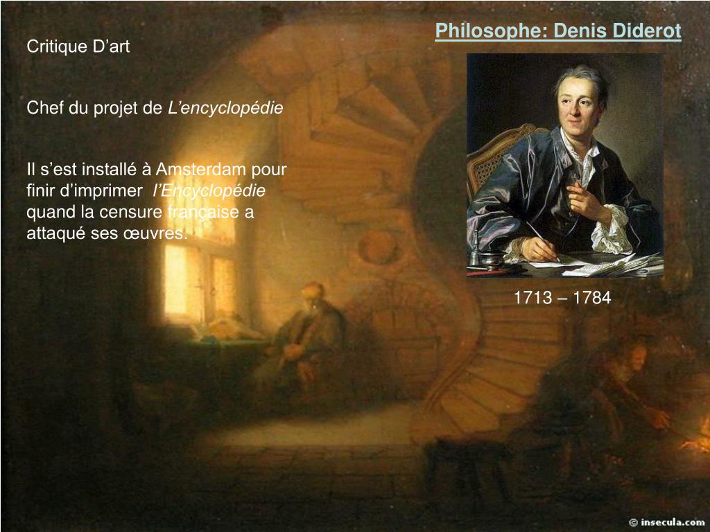 Philosophe: Denis Diderot Critique D’art Chef du projet de L’encyclopédie Il s’est installé à Amsterdam pour finir d’imprimer l’Encyclopédie quand la censure française a attaqué ses œuvres. 1713 – 1784