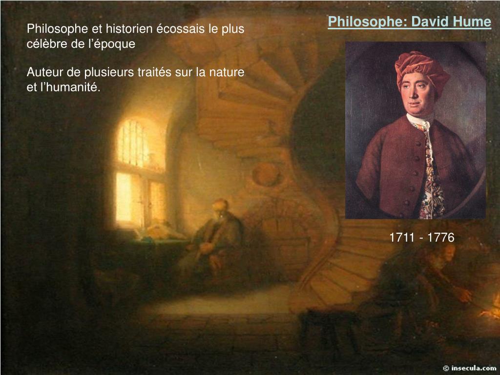 Philosophe: David Hume Philosophe et historien écossais le plus célèbre de l’époque Auteur de plusieurs traités sur la nature et l’humanité. 1711 - 1776