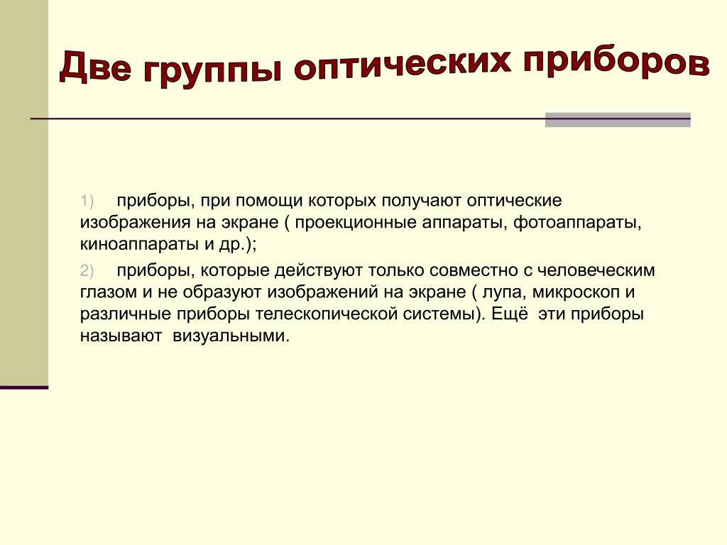 Две группы оптических приборов • приборы, при помощи которых получают оптические изображения на экране ( проекционные аппараты, фотоаппараты, киноаппараты и др.); • приборы, которые действуют только совместно с человеческим глазом и не образуют изображений на экране ( лупа, микроскоп и различные приборы телескопической системы). Ещё эти приборы называют визуальными.