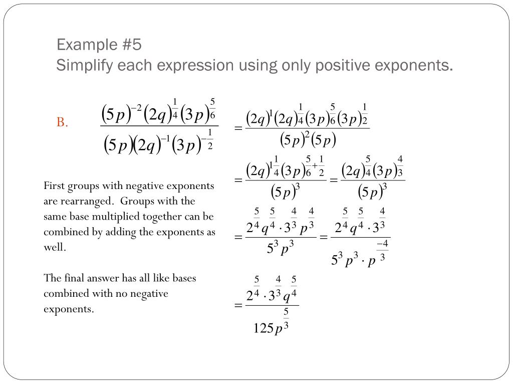 Example #4Simplify each expression using only positive exponents. Rewrite numbers into their prime factorization. Power to a power rule says to multiply exponents. Rewrite radicals as fraction exponents. When multiplying like bases, ADD the exponents.