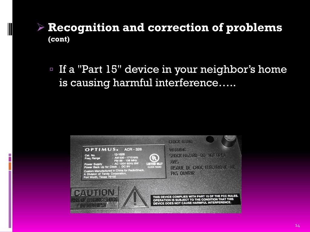 Recognition and correction of problems(cont) • If a "Part 15" device in your neighbor’s home is causing harmful interference…..
