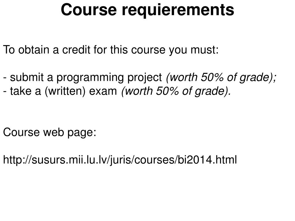 Course requierements To obtain a credit for this course you must: - submit a programming project (worth 50% of grade);- take a (written) exam (worth 50% of grade). Course web page: http://susurs.mii.lu.lv/juris/courses/bi2014.html