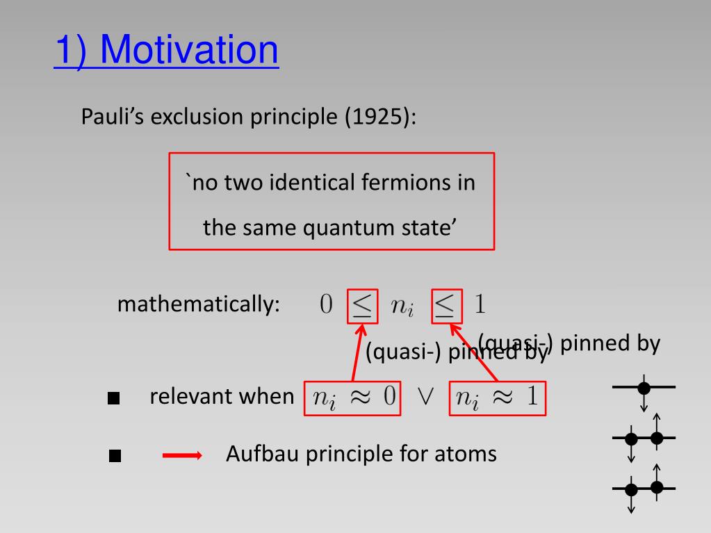 1) Motivation Pauli’sexclusionprinciple (1925): `notwoidenticalfermions in the same quantumstate’ mathematically: (quasi-) pinnedby (quasi-) pinnedby relevant when Aufbau principleforatoms