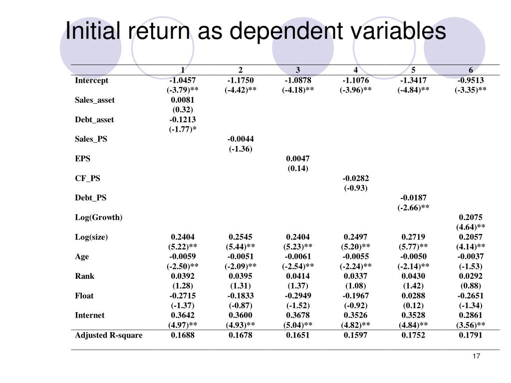 Regression Analysis- Initial return as dependent variables INIRET i= i + ij UNCERij +ij CVij + i DUMMYi + I INIRET: initial returns UN UNCER: uncertainty variables; including pre-IPO operating performance measures, firm size, and firm age. CV: control variables; including underwriter’s ranking and float. DUMMY: Internet dummy variables.