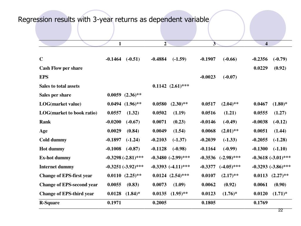 Main Results- cont. • If 3-year buy and hold return as dependent variable, all Internet dummy variables are significant negative; • Fundamental variables like sales per share and sales to total assets are significantly positive • Change of firms EPS in the three year period can also predict firms long run performance • Extra hot IPOs have the worst returns.
