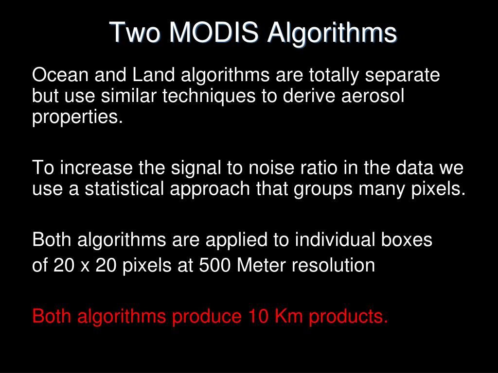 Ocean and Land algorithms are totally separate but use similar techniques to derive aerosol properties. To increase the signal to noise ratio in the data we use a statistical approach that groups many pixels. Both algorithms are applied to individual boxes of 20 x 20 pixels at 500 Meter resolution Both algorithms produce 10 Km products. Two MODIS Algorithms