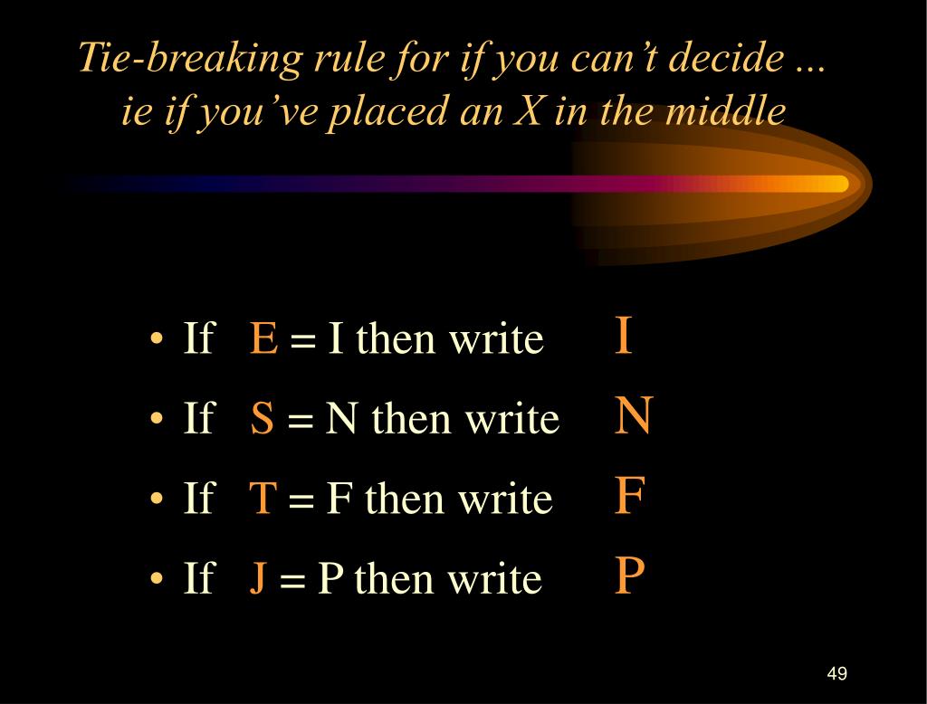 Tie-breaking rule for if you can’t decide ... ie if you’ve placed an X in the middle • If E = I then write I • If S = N then write N • If T = F then write F • If J = P then write P