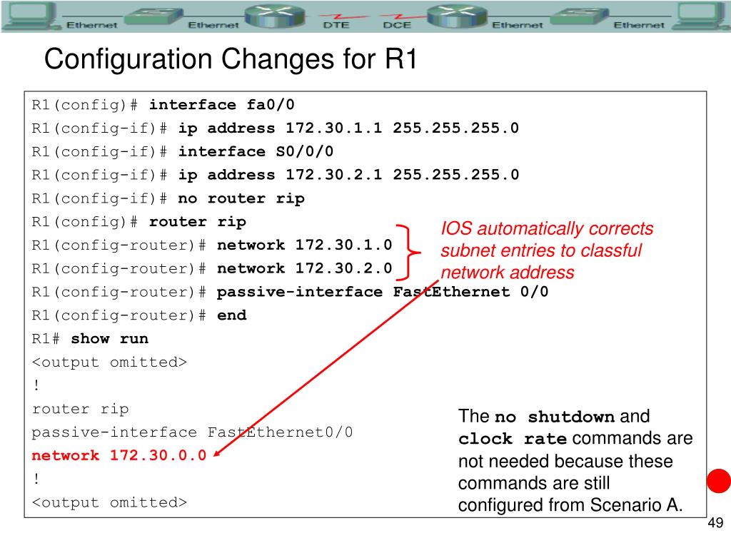 Configuration Changes for R1 R1(config)# interface fa0/0 R1(config-if)# ip address 172.30.1.1 255.255.255.0 R1(config-if)# interface S0/0/0 R1(config-if)# ip address 172.30.2.1 255.255.255.0 R1(config-if)# no router rip R1(config)# router rip R1(config-router)# network 172.30.1.0 R1(config-router)# network 172.30.2.0 R1(config-router)# passive-interface FastEthernet 0/0 R1(config-router)# end R1# show run <output omitted> ! router rip passive-interface FastEthernet0/0 network 172.30.0.0 ! <output omitted> IOS automatically corrects subnet entries to classful network address The no shutdown and clock rate commands are not needed because these commands are still configured from Scenario A.