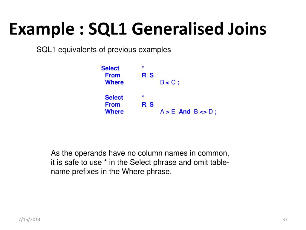 Example : SQL1 Generalised Joins SQL1 equivalents of previous examples As the operands have no column names in common, it is safe to use * in the Select phrase and omit table-name prefixes in the Where phrase.