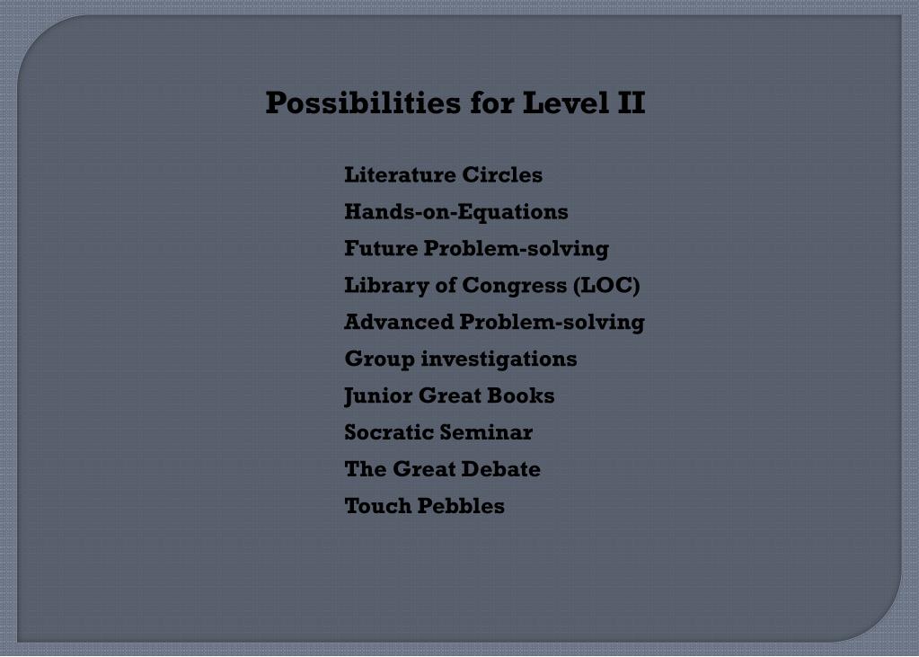 Possibilities for Level II Literature Circles Hands-on-Equations Future Problem-solving Library of Congress (LOC) Advanced Problem-solving Group investigations Junior Great Books Socratic Seminar The Great Debate Touch Pebbles