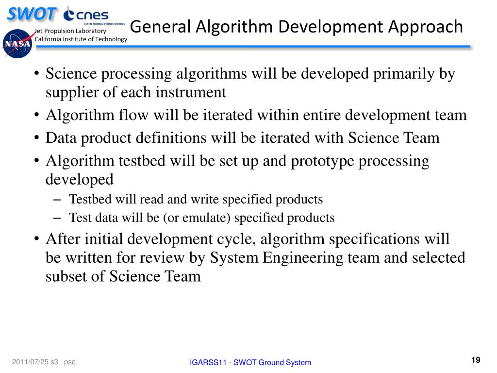General Algorithm Development Approach • Science processing algorithms will be developed primarily by supplier of each instrument • Algorithm flow will be iterated within entire development team • Data product definitions will be iterated with Science Team • Algorithm testbed will be set up and prototype processing developed • Testbed will read and write specified products • Test data will be (or emulate) specified products • After initial development cycle, algorithm specifications will be written for review by System Engineering team and selected subset of Science Team IGARSS11 - SWOT Ground System