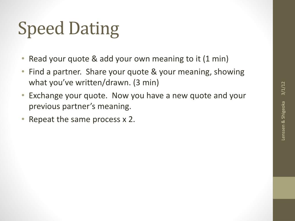 Speed Dating • Read your quote & add your own meaning to it (1 min) • Find a partner. Share your quote & your meaning, showing what you’ve written/drawn. (3 min) • Exchange your quote. Now you have a new quote and your previous partner’s meaning. • Repeat the same process x 2. Lenssen & Shigeoka