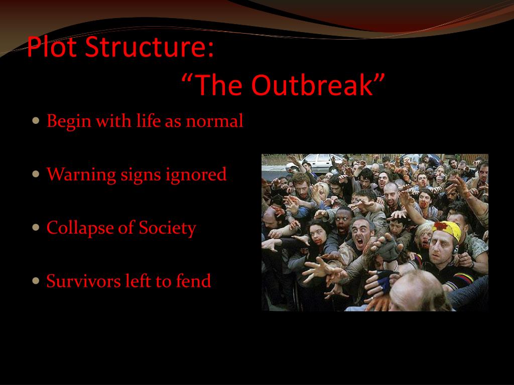 Plot Structure: “The Outbreak” • Begin with life as normal • Warning signs ignored • Collapse of Society • Survivors left to fend