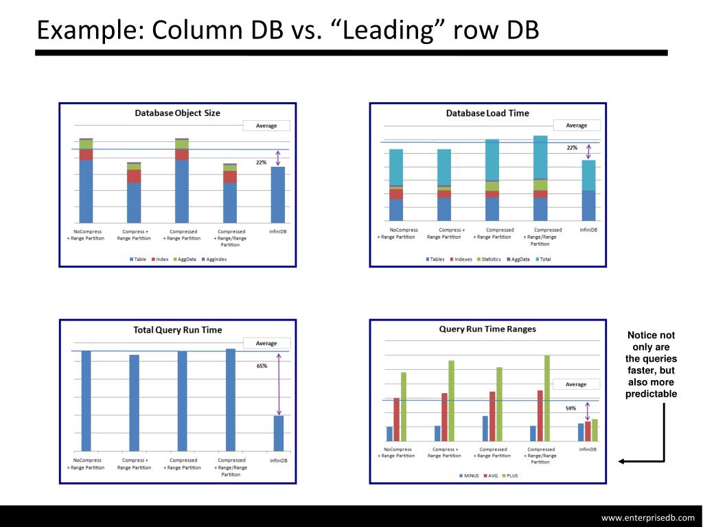 Example: Column DB vs. “Leading” row DB InfiniDB takes up 22% less space InfiniDB loaded data 22% faster InfiniDB total query times were 65% less InfiniDB average query times were 59% less Notice not only are the queries faster, but also more predictable * Tests run on standalone machine: 16 CPU, 16GB RAM, CentOS 5.4 with 2TB of raw data