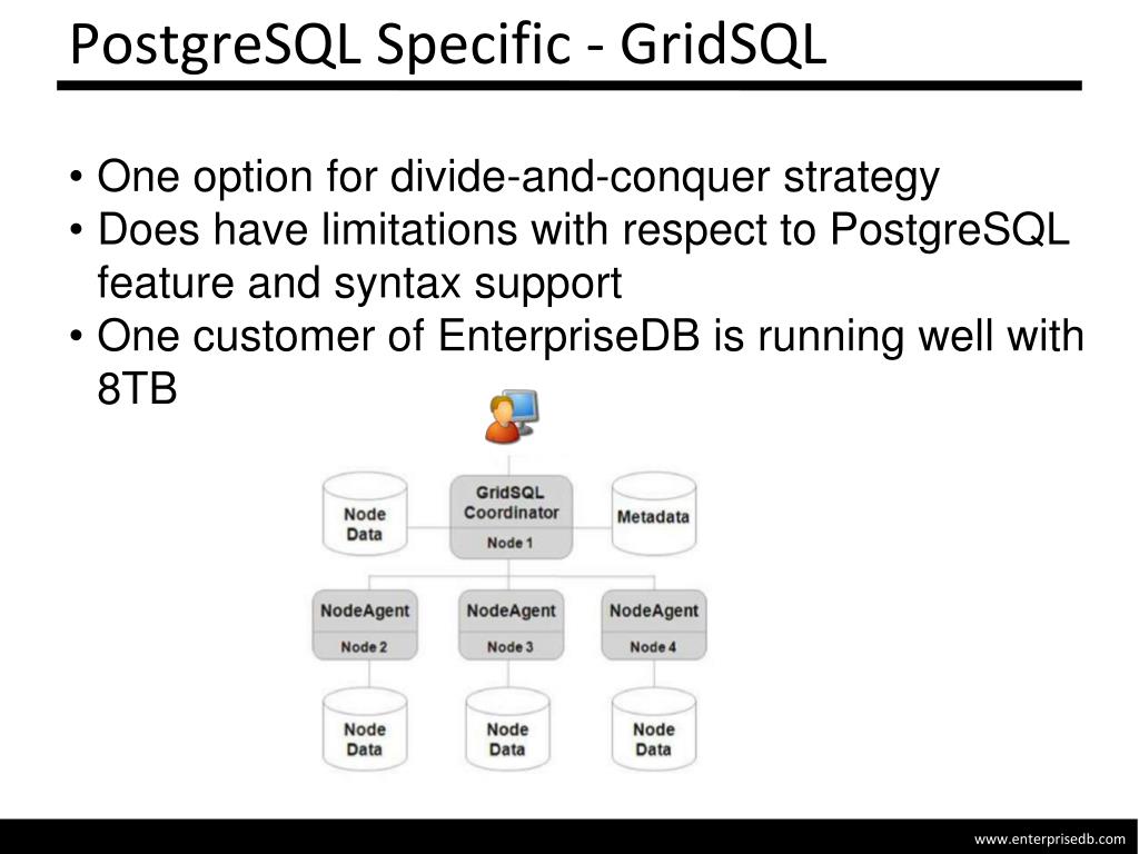 PostgreSQL Specific - GridSQL • One option for divide-and-conquer strategy • Does have limitations with respect to PostgreSQL feature and syntax support • One customer of EnterpriseDB is running well with 8TB