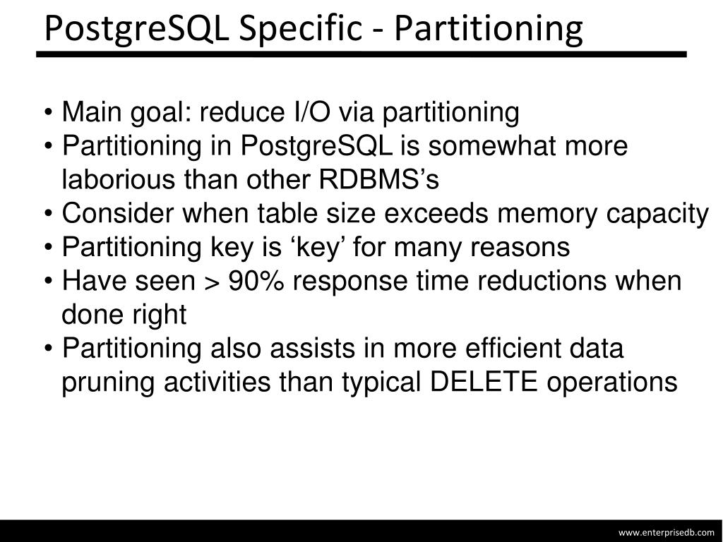 PostgreSQL Specific - Partitioning • Main goal: reduce I/O via partitioning • Partitioning in PostgreSQL is somewhat more laborious than other RDBMS’s • Consider when table size exceeds memory capacity • Partitioning key is ‘key’ for many reasons • Have seen > 90% response time reductions when done right • Partitioning also assists in more efficient data pruning activities than typical DELETE operations