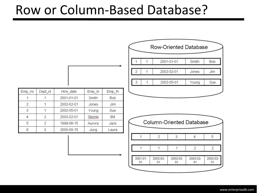 Hybrid Row / Column Databases Some vendors now give you a choice of table format – row or column – based on expected access patterns.