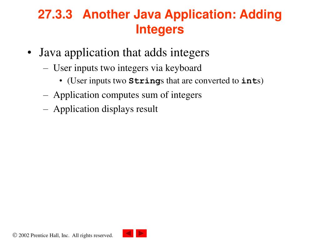 27.3.3 Another Java Application: Adding Integers • Java application that adds integers • User inputs two integers via keyboard • (User inputs two Strings that are converted to ints) • Application computes sum of integers • Application displays result