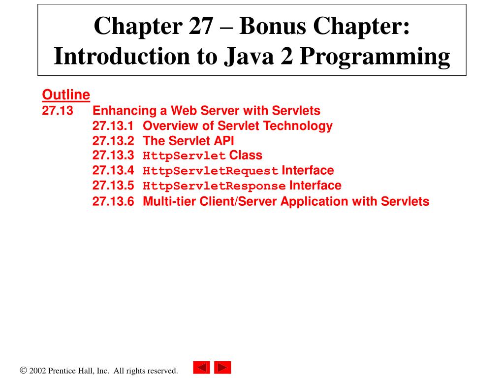 Chapter 27 – Bonus Chapter: Introduction to Java 2 Programming Outline27.13 Enhancing a Web Server with Servlets 27.13.1 Overview of Servlet Technology 27.13.2 The Servlet API 27.13.3 HttpServlet Class 27.13.4 HttpServletRequest Interface 27.13.5 HttpServletResponse Interface 27.13.6 Multi-tier Client/Server Application with Servlets