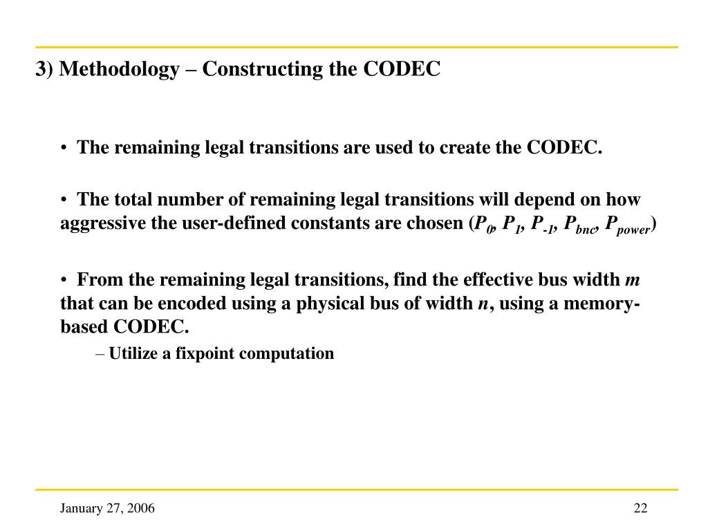 3) Methodology – Constructing the CODEC The remaining legal transitions are used to create the CODEC. The total number of remaining legal transitions will depend on how aggressive the user-defined constants are chosen (P0, P1, P-1, Pbnc, Ppower) From the remaining legal transitions, find the effective bus width m that can be encoded using a physical bus of width n, using a memory-based CODEC. Utilize a fixpoint computation