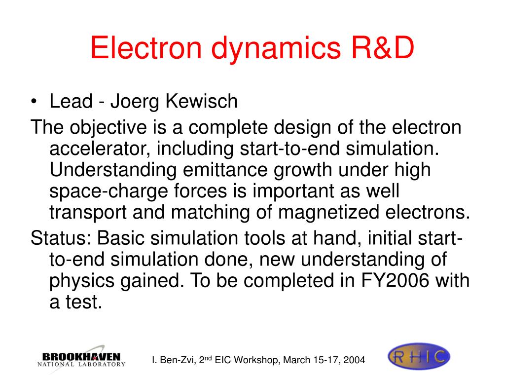 Electron dynamics R&D • Lead - Joerg Kewisch The objective is a complete design of the electron accelerator, including start-to-end simulation. Understanding emittance growth under high space-charge forces is important as well transport and matching of magnetized electrons. Status: Basic simulation tools at hand, initial start-to-end simulation done, new understanding of physics gained. To be completed in FY2006 with a test. I. Ben-Zvi, 2nd EIC Workshop, March 15-17, 2004