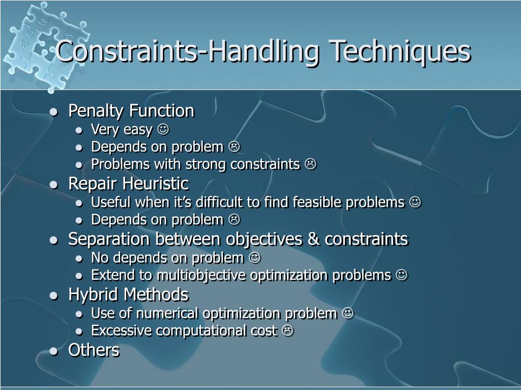Constraints-Handling Techniques • Penalty Function • Very easy • Depends on problem • Problems with strong constraints • Repair Heuristic • Useful when it’s difficult to find feasible problems • Depends on problem • Separation between objectives & constraints • No depends on problem • Extend to multiobjective optimization problems • Hybrid Methods • Use of numerical optimization problem • Excessive computational cost • Others