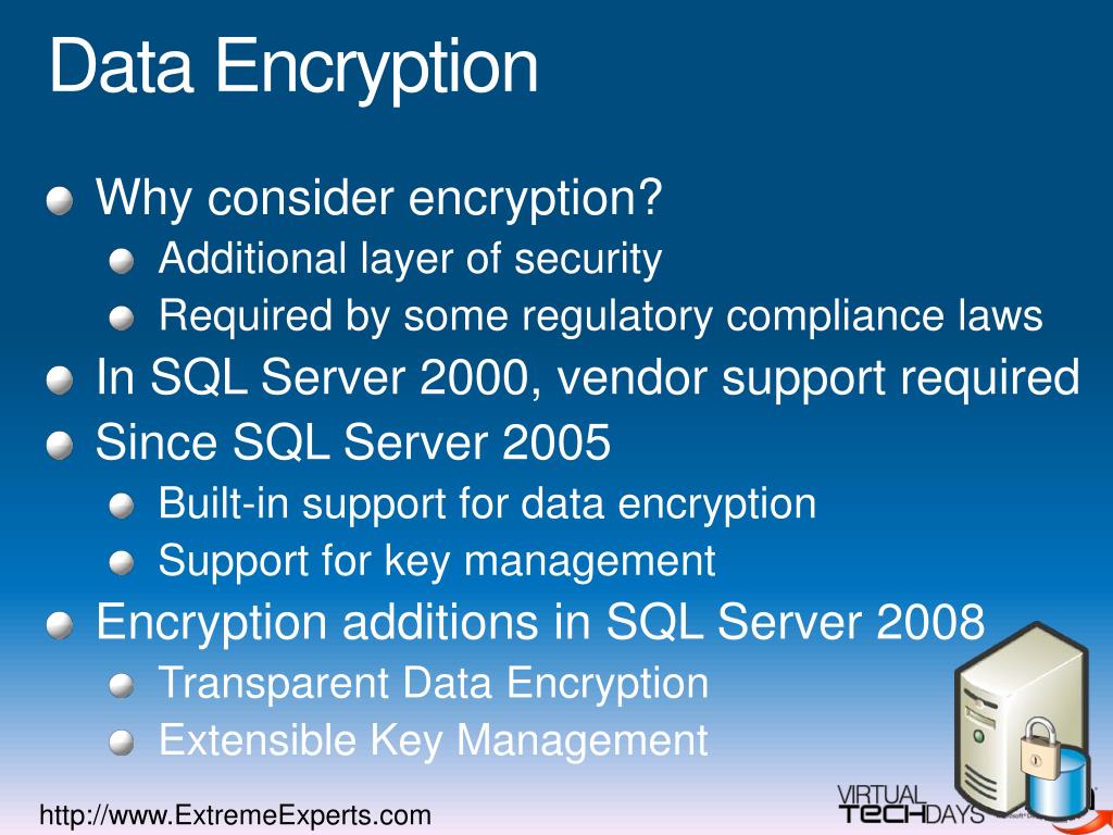 Data Encryption • Why consider encryption? • Additional layer of security • Required by some regulatory compliance laws • In SQL Server 2000, vendor support required • Since SQL Server 2005 • Built-in support for data encryption • Support for key management • Encryption additions in SQL Server 2008 • Transparent Data Encryption • Extensible Key Management