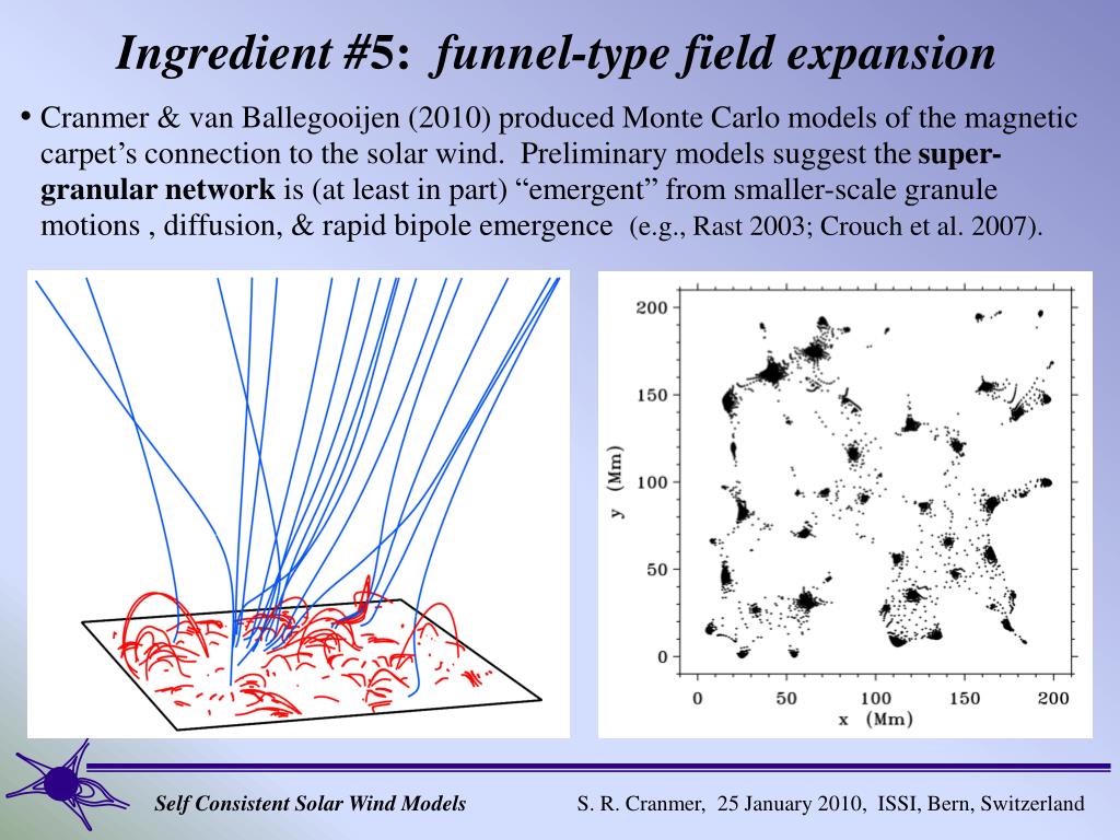 Ingredient #5: funnel-type field expansion • Cranmer & van Ballegooijen (2010) produced Monte Carlo models of the magnetic carpet’s connection to the solar wind. Preliminary models suggest the super-granular network is (at least in part) “emergent” from smaller-scale granule motions , diffusion, & rapid bipole emergence (e.g., Rast 2003; Crouch et al. 2007).