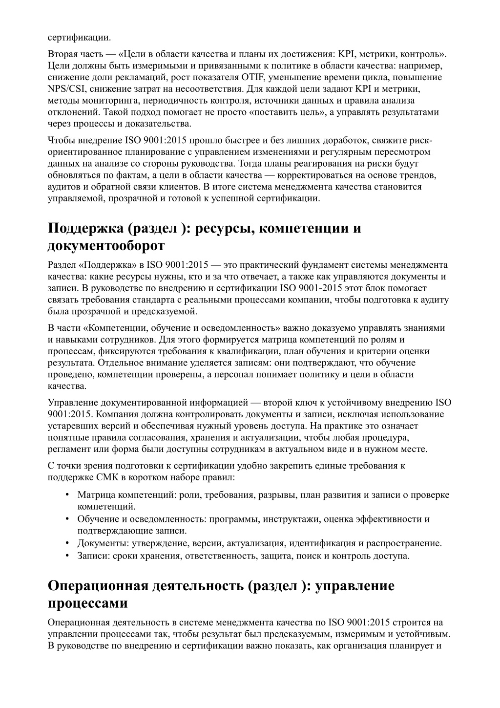 сертификации. Вторая часть — «Цели в области качества и планы их достижения: KPI, метрики, контроль». Цели должны быть измеримыми и привязанными к политике в области качества: например, снижение доли рекламаций, рост показателя OTIF, уменьшение времени цикла, повышение NPS/CSI, снижение затрат на несоответствия. Для каждой цели задают KPI и метрики, методы мониторинга, периодичность контроля, источники данных и правила анализа отклонений. Такой подход помогает не просто «поставить цель», а управлять результатами через процессы и доказательства. Чтобы внедрение ISO 9001:2015 прошло быстрее и без лишних доработок, свяжите риск- ориентированное планирование с управлением изменениями и регулярным пересмотром данных на анализе со стороны руководства. Тогда планы реагирования на риски будут обновляться по фактам, а цели в области качества — корректироваться на основе трендов, аудитов и обратной связи клиентов. В итоге система менеджмента качества становится управляемой, прозрачной и готовой к успешной сертификации. Поддержка (раздел ): ресурсы, компетенции и документооборот Раздел «Поддержка» в ISO 9001:2015 — это практический фундамент системы менеджмента качества: какие ресурсы нужны, кто и за что отвечает, а также как управляются документы и записи. В руководстве по внедрению и сертификации ISO 9001-2015 этот блок помогает связать требования стандарта с реальными процессами компании, чтобы подготовка к аудиту была прозрачной и предсказуемой. В части «Компетенции, обучение и осведомленность» важно доказуемо управлять знаниями и навыками сотрудников. Для этого формируется матрица компетенций по ролям и процессам, фиксируются требования к квалификации, план обучения и критерии оценки результата. Отдельное внимание уделяется записям: они подтверждают, что обучение проведено, компетенции проверены, а персонал понимает политику и цели в области качества. Управление документированной информацией — второй ключ к устойчивому внедрению ISO 9001:2015. Компания должна контролировать документы и записи, исключая использование устаревших версий и обеспечивая нужный уровень доступа. На практике это означает понятные правила согласования, хранения и актуализации, чтобы любая процедура, регламент или форма были доступны сотрудникам в актуальном виде и в нужном месте. С точки зрения подготовки к сертификации удобно закрепить единые требования к поддержке СМК в коротком наборе правил: • Матрица компетенций: роли, требования, разрывы, план развития и записи о проверке компетенций. • Обучение и осведомленность: программы, инструктажи, оценка эффективности и подтверждающие записи. • Документы: утверждение, версии, актуализация, идентификация и распространение. • Записи: сроки хранения, ответственность, защита, поиск и контроль доступа. Операционная деятельность (раздел ): управление процессами Операционная деятельность в системе менеджмента качества по ISO 9001:2015 строится на управлении процессами так, чтобы результат был предсказуемым, измеримым и устойчивым. В руководстве по внедрению и сертификации важно показать, как организация планирует и