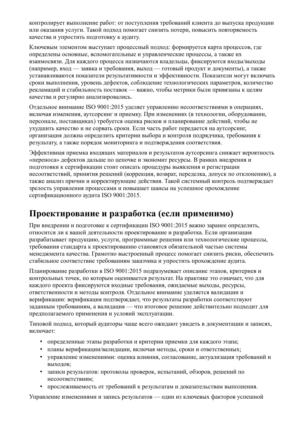 контролирует выполнение работ: от поступления требований клиента до выпуска продукции или оказания услуги. Такой подход помогает снизить потери, повысить повторяемость качества и упростить подготовку к аудиту. Ключевым элементом выступает процессный подход: формируется карта процессов, где определены основные, вспомогательные и управленческие процессы, а также их взаимосвязи. Для каждого процесса назначаются владельцы, фиксируются входы/выходы (например, вход — заявка и требования, выход — готовый продукт и документы), а также устанавливаются показатели результативности и эффективности. Показатели могут включать сроки выполнения, уровень дефектов, соблюдение технологических параметров, количество рекламаций и стабильность поставок — важно, чтобы метрики были привязаны к целям качества и регулярно анализировались. Отдельное внимание ISO 9001:2015 уделяет управлению несоответствиями в операциях, включая изменения, аутсорсинг и приемку. При изменениях (в технологии, оборудовании, персонале, поставщиках) требуется оценка рисков и планирование действий, чтобы не ухудшить качество и не сорвать сроки. Если часть работ передается на аутсорсинг, организация должна определить критерии выбора и контроля подрядчика, требования к результату, а также порядок мониторинга и подтверждения соответствия. Эффективная приемка входящих материалов и результатов аутсорсинга снижает вероятность «переноса» дефектов дальше по цепочке и экономит ресурсы. В рамках внедрения и подготовки к сертификации стоит описать процедуры выявления и регистрации несоответствий, принятия решений (коррекция, возврат, переделка, допуск по отклонению), а также анализ причин и корректирующие действия. Такой системный контроль подтверждает зрелость управления процессами и повышает шансы на успешное прохождение сертификационного аудита ISO 9001:2015. Проектирование и разработка (если применимо) При внедрении и подготовке к сертификации ISO 9001:2015 важно заранее определить, относится ли к вашей деятельности проектирование и разработка. Если организация разрабатывает продукцию, услуги, программные решения или технологические процессы, требования стандарта к проектированию становятся обязательной частью системы менеджмента качества. Грамотно выстроенный процесс помогает снизить риски, обеспечить стабильное соответствие требованиям заказчика и упростить прохождение аудита. Планирование разработки в ISO 9001:2015 подразумевает описание этапов, критериев и контрольных точек, по которым оценивается результат. На практике это означает, что для каждого проекта фиксируются входные требования, ожидаемые выходы, ресурсы, ответственности и методы контроля. Отдельное внимание уделяется валидации и верификации: верификация подтверждает, что результаты разработки соответствуют заданным требованиям, а валидация — что итоговое решение действительно подходит для предполагаемого применения и условий эксплуатации. Типовой подход, который аудиторы чаще всего ожидают увидеть в документации и записях, включает: • определенные этапы разработки и критерии приемки для каждого этапа; • планы верификации/валидации, включая методы, сроки и ответственных; • управление изменениями: оценка влияния, согласование, актуализация требований и выходов; • записи результатов: прото