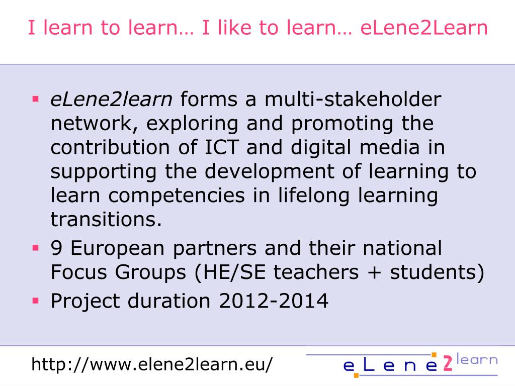 I learn to learn… I like to learn… eLene2Learn eLene2learn forms a multi-stakeholder network, exploring and promoting the contribution of ICT and digital media in supporting the development of learning to learn competencies in lifelong learning transitions. 9 European partners and their national Focus Groups (HE/SE teachers + students) Project duration 2012-2014 http://www.elene2learn.eu/
