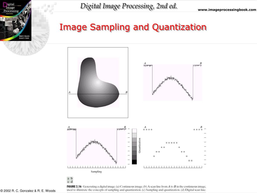 Sampling: digitizing the 2-dimensional spatial coordinate values Quantization: digitizing the amplitude values (brightness level) Image Sampling and Quantization