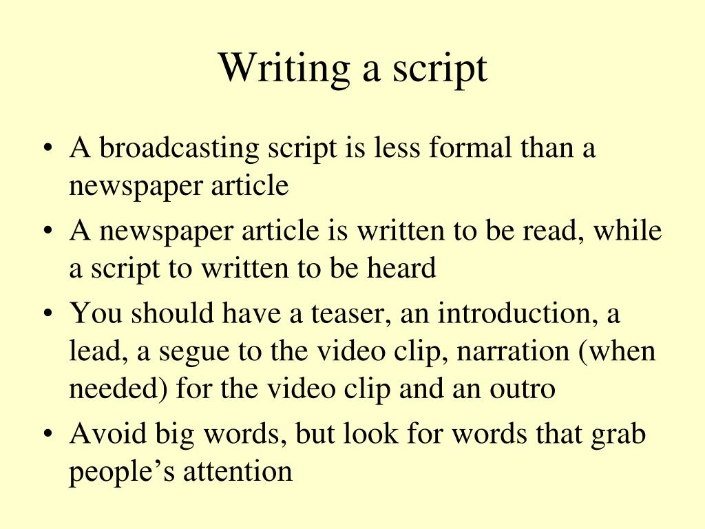 Keys to a successful broadcast. Writing a script. A broadcasting script is less formal than a newspaper article A newspaper article is written to be read, while a script to written to be heard