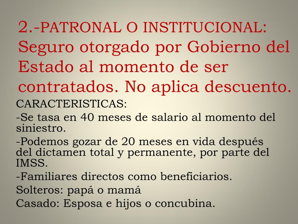 2.-PATRONAL O INSTITUCIONAL: Seguro otorgado por Gobierno del Estado al momento de ser contratados. No aplica descuento. CARACTERISTICAS: -Se tasa en 40 meses de salario al momento del siniestro. -Podemos gozar de 20 meses en vida después del dictamen total y permanente, por parte del IMSS. -Familiares directos como beneficiarios. Solteros: papá o mamá Casado: Esposa e hijos o concubina.