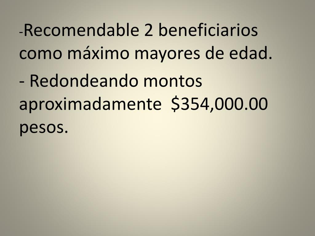 -Recomendable 2 beneficiarios como máximo mayores de edad. - Redondeando montos aproximadamente $354,000.00 pesos.