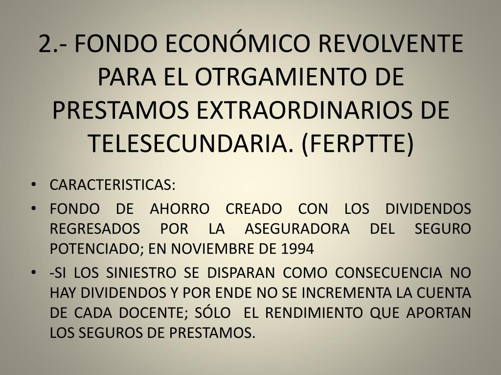 2.- FONDO ECONÓMICO REVOLVENTE PARA EL OTRGAMIENTO DE PRESTAMOS EXTRAORDINARIOS DE TELESECUNDARIA. (FERPTTE) • CARACTERISTICAS: • FONDO DE AHORRO CREADO CON LOS DIVIDENDOS REGRESADOS POR LA ASEGURADORA DEL SEGURO POTENCIADO; EN NOVIEMBRE DE 1994 • -SI LOS SINIESTRO SE DISPARAN COMO CONSECUENCIA NO HAY DIVIDENDOS Y POR ENDE NO SE INCREMENTA LA CUENTA DE CADA DOCENTE; SÓLO EL RENDIMIENTO QUE APORTAN LOS SEGUROS DE PRESTAMOS.