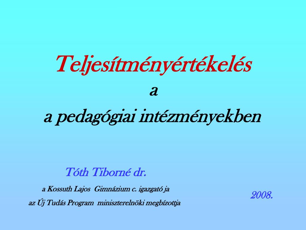 Teljesítményértékelés a a pedagógiai intézményekben Tóth Tiborné dr. a Kossuth Lajos Gimnázium c. igazgató ja az Új Tudás Program miniszterelnöki megbízottja 2008.