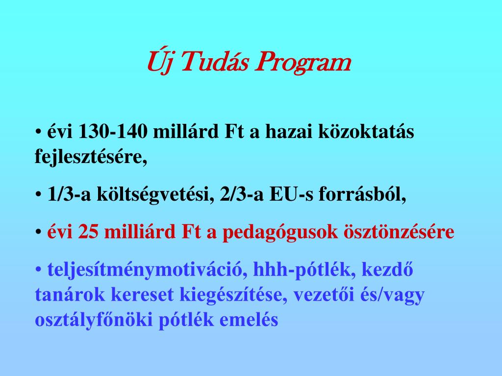 évi 130-140 millárd Ft a hazai közoktatás fejlesztésére, • 1/3-a költségvetési, 2/3-a EU-s forrásból, • évi 25 milliárd Ft a pedagógusok ösztönzésére • teljesítménymotiváció, hhh-pótlék, kezdő tanárok kereset kiegészítése, vezetői és/vagy osztályfőnöki pótlék emelés Új Tudás Program