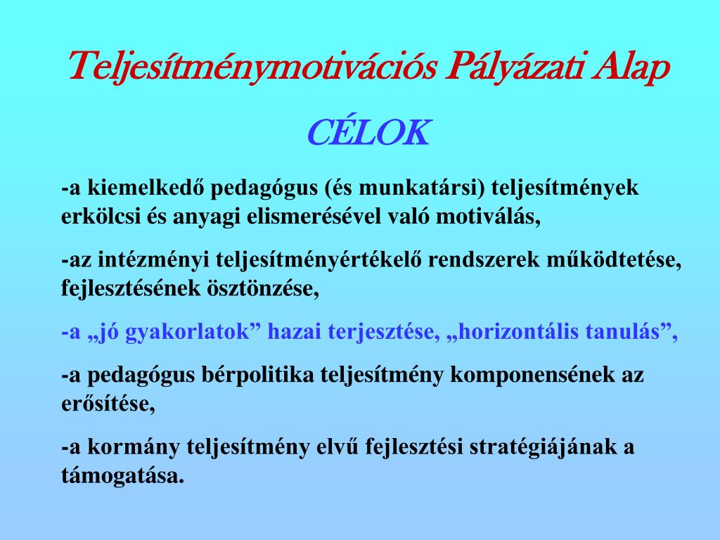 Teljesítménymotivációs Pályázati Alap CÉLOK -a kiemelkedő pedagógus (és munkatársi) teljesítmények erkölcsi és anyagi elismerésével való motiválás, -az intézményi teljesítményértékelő rendszerek működtetése, fejlesztésének ösztönzése, -a „jó gyakorlatok” hazai terjesztése, „horizontális tanulás”, -a pedagógus bérpolitika teljesítmény komponensének az erősítése, -a kormány teljesítmény elvű fejlesztési stratégiájának a támogatása.
