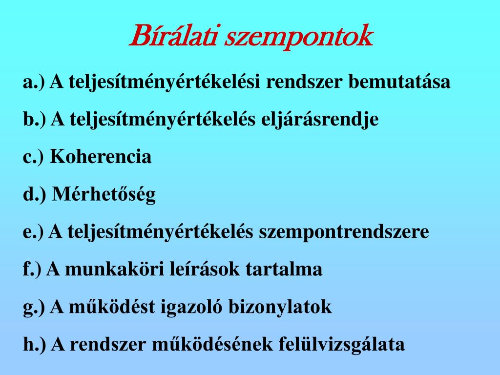 Bírálati szempontok a.) A teljesítményértékelési rendszer bemutatása b.) A teljesítményértékelés eljárásrendje c.) Koherencia d.) Mérhetőség e.) A teljesítményértékelés szempontrendszere f.) A munkaköri leírások tartalma g.) A működést igazoló bizonylatok h.) A rendszer működésének felülvizsgálata