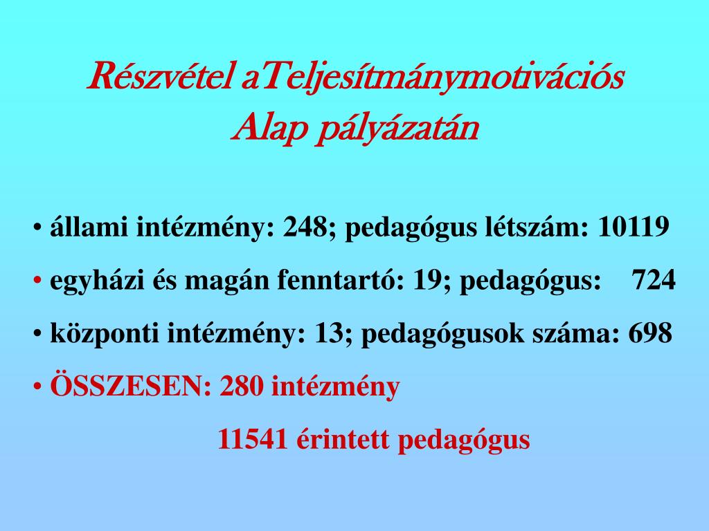 Részvétel aTeljesítmánymotivációs Alappályázatán • állami intézmény: 248; pedagógus létszám: 10119 • egyházi és magán fenntartó: 19; pedagógus: 724 • központi intézmény: 13; pedagógusok száma: 698 • ÖSSZESEN: 280 intézmény • 11541 érintett pedagógus