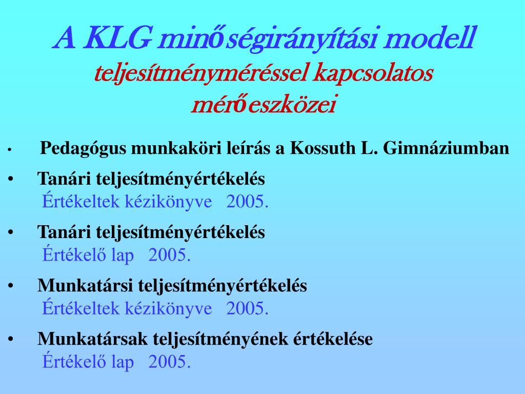A KLG minőségirányítási modellteljesítményméréssel kapcsolatos mérőeszközei • Pedagógus munkaköri leírás a Kossuth L. Gimnáziumban • Tanári teljesítményértékelés • Értékeltek kézikönyve 2005. • Tanári teljesítményértékelés • Értékelő lap 2005. • Munkatársi teljesítményértékelés • Értékeltek kézikönyve 2005. • Munkatársak teljesítményének értékelése • Értékelő lap 2005.