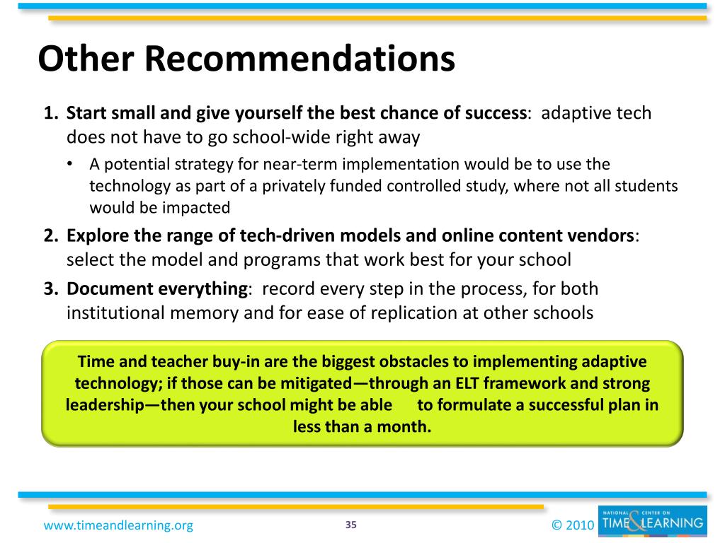 Other Recommendations Time and teacher buy-in are the biggest obstacles to implementing adaptive technology; if those can be mitigated—through an ELT framework and strong leadership—then your school might be able to formulate a successful plan in less than a month. • Start small and give yourself the best chance of success: adaptive tech does not have to go school-wide right away • A potential strategy for near-term implementation would be to use the technology as part of a privately funded controlled study, where not all students would be impacted • Explore the range of tech-driven models and online content vendors: select the model and programs that work best for your school • Document everything: record every step in the process, for both institutional memory and for ease of replication at other schools